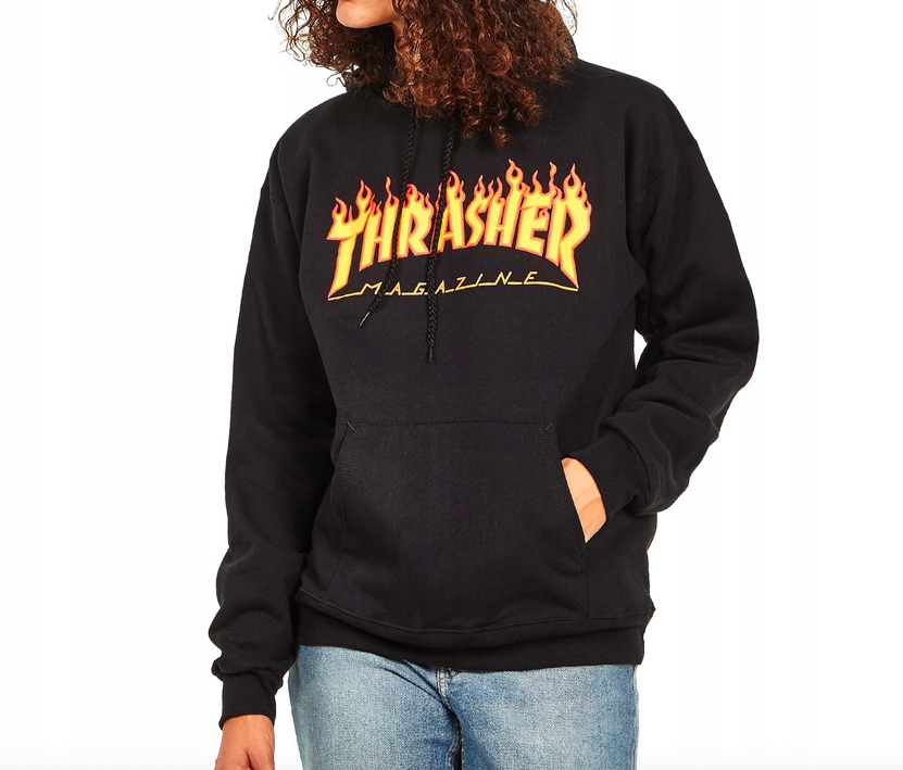 Marka skateboardowa powiązana z miesięcznikiem thrasher powstałym w 1981roku. Produkty marki thrasher rozpoznawane są na całym świecie. Z o o podmioty powiązane i partnerów biznesowych. Black kieszeń typu kangur model ma 181cm wzrostu prezentowany rozmiar to m.